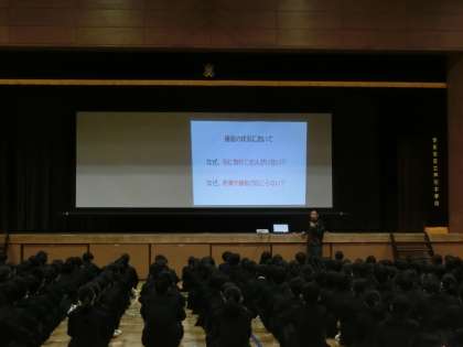 12月10日(月)に大野先生による人格の完成が行われました。今月のテーマは「礼儀」です。大野先生は、2011年の東日本大震災のニュースから、私たち日本人の「礼儀」についてお話をしてくれました。