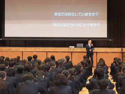 自立は、金銭面・精神面・生活面の種類があります。皆さんは自立していると言えるでしょうか。中学生が1人で生計を立てたりして金銭的に自立するというのは難しいことです。しかし、精神面や生活面の自立というのは、中学生でも目指すことができます。挨拶をきちんとする、時間に遅れない、自分の気持ちをコントロールする…日常生活には、私たちが一生懸命取り組めば、達成できる自立が沢山あります。