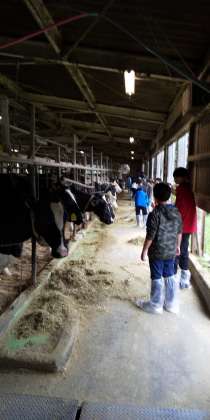 乳牛に餌をあげています。みんな楽しそうにやってます!