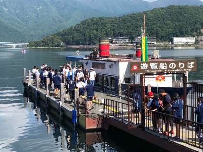 2日目は、遊覧船に乗っての河口湖巡りから始まります。天気もよく、最高の眺めです。