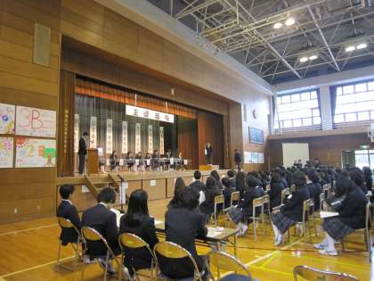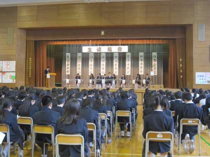 5月6日(金)に、前期生徒総会がありました。生徒会長、学級委員長を始め、各委員長が今年度の方針や活動を報告しました。また、各クラスの学級目標を発表しました。