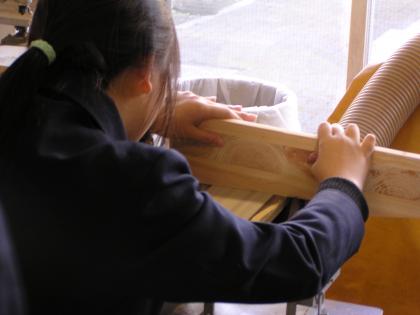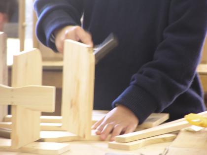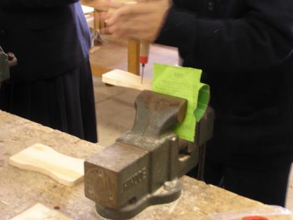 現在、1年生の技術の授業では木材加工に取り組んでいます。技術の先生の指導のもと、本箱、小物入れなどをキリやのこぎり、金槌などの道具を活用して製作します。完成したら各家庭に持ち帰り、毎日の生活に活用することができます。
