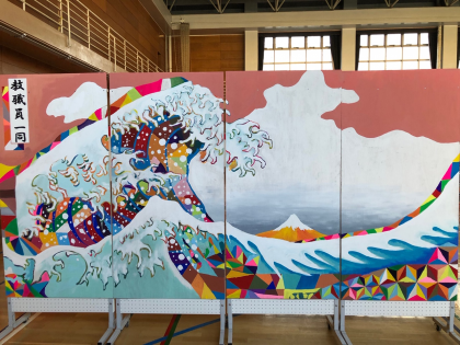 左の写真…卒業式に向けて先生たちが作った巨大屏風