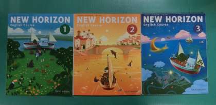 上の写真は芦花中学校で使っている英語の教科書『NEW HORIZON』です。左から1年生2年生、3年生の教科書です。3冊の表紙絵を見比べていると・・・あることに気がつきませんか?