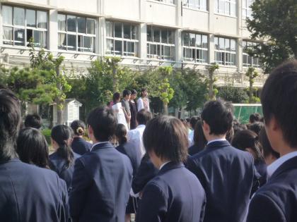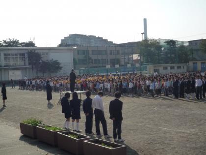 10月20日(月)芦花小学校と合同の全校朝会が行われました。中学校からは25日に行われる学芸発表会の話題、小学校からは校舎改築の話題がありました。その後、後期生徒会、児童会の役員紹介とスローガンの発表がありました。小学校ではマスコットの『ろからす』のお披露目が行われました。