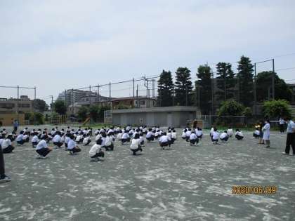 3年生とI組は6月8日(月)の10:20〜10:40に、報道にあった事態への対応として、校庭へ緊急避難をしました。事前に避難訓練は実施されていませんでしたが、素早く整然と避難することができました。