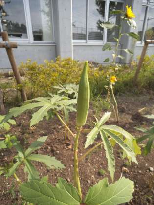 さてさて、話は変わりますが、芦花小・中の職員室を出たところに、トマトが赤く色づいていたり、ひまわりが咲いていたりしているのを見かけた人もいると思います。そのすぐ近くに、写真にあるようなオクラが育っています。オクラはどのようになっているかご存知ですか。収穫前のオクラを見たことがある人や、写真で気づいた人もいると思います。そう、オクラは上向きに育つんですね。オクラ以外にも、上向きに育つ実があるようです。