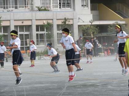 今年は、「ソーシャルディスタンス大縄」という新種目に挑戦しました。1度に10人しか飛ばない、10回飛んだら次のチームと入れ替わる。その合図は担任が出す、というものです。