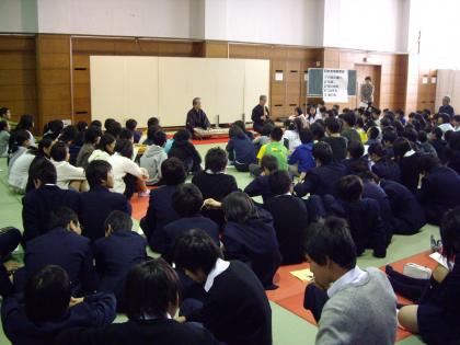 11月13日(木)5校時、箏鑑賞会がありました。芦花小学校6年生と芦花中学校の2年生が一緒に箏の響きを楽しみました。演奏者は、佐藤吉和さん(箏・三味線)橋本洋さん(尺八)佐藤京子さん(箏)。演奏曲は、「六段の調」「比良」「祭の太鼓」「コスモス」「春の海」でした。