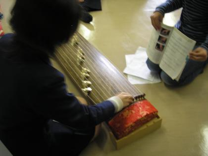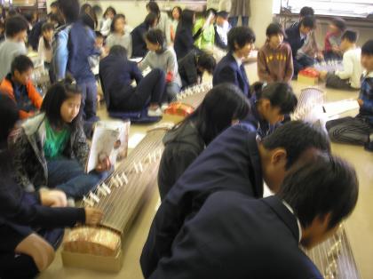 11月14日(金)2校時、4校時を使い、箏の演奏発表会が行われました。芦花中学校の2年生が、芦花小学校の6年生児童に、弾き方を教え、「さくら」の演奏をしました。狭いミーティングルームの中、お兄さんお姉さんの貫禄十分に、小学生の面倒を見ている姿は、感動的ですらありました。