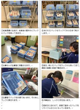 給食後に、一人一人が牛乳パックを所定のケースに入れます。係の生徒はそのケースを指定のラックに運びます。洗浄は、感染症対策のため、学校主事さんが主事室で(お湯で)丁寧に行っています。牛乳パックは、ラックに戻され、次の日までそこで乾かされます。