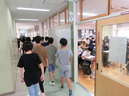 小学生たちは廊下から授業を覗いたり、掲示してある高校のポスターを見ながら、中学校の雰囲気を感じ取っていました。