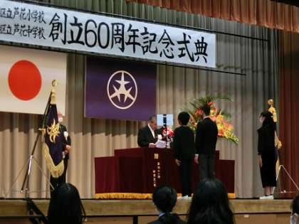 式典は、国歌斉唱、小学校校長式辞、中学校校長式辞と続き、記念品贈呈となりました。