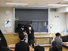 写真は給食委員と保健員の報告の様子です。