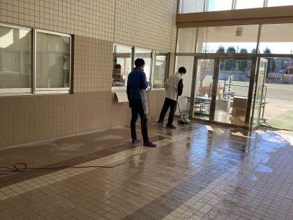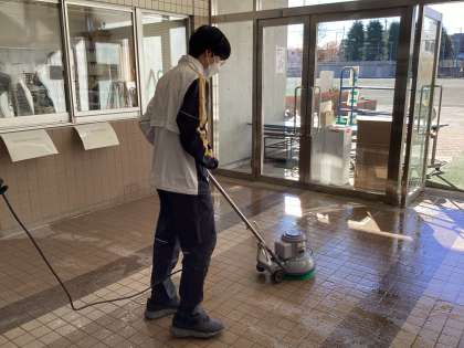 ソシオさんがピロティを電動ポリッシャーブラシで、掃除中です。