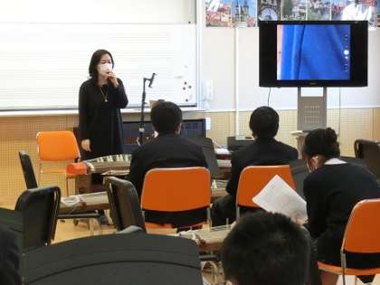 今回は、専門家の方から楽器の由来や説明などをうけました。楽器の裏側を見たり、楽器の中に手を入れて触ってみたりして、生徒たちは「おー」とか「えー」とか言いながら楽しんでいて、「琴」にさらに親しみをもてたようです。