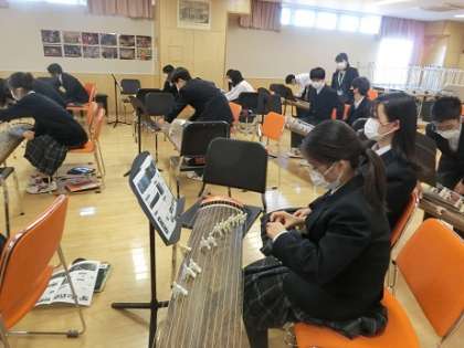 1月20日に1年生はクラスごとに、ゲストティーチャーをお迎えして「琴」の授業を受けました。今の1年生は、2年前の小学校5年生の時に中学生から「さくらさくら」を教えてもらっています。多くの生徒は覚えているようでした。