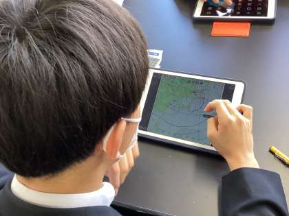 本日の授業はタブレット端末を用いて、低気圧が発生してから消滅するまでの様子を、