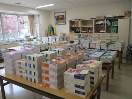本日はあいにくの天気ですが、皆さんが気持ちよく新年度を迎えられるように準備を進めています。教科書も準備万端です!手前から3年生→2年生→1年生と並んでいます。