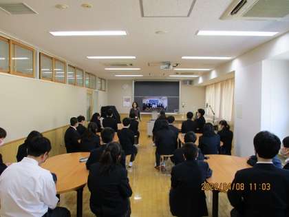 3時間目は、生徒会企画の新入生歓迎会があり、委員会紹介動画とI組紹介動画をみました。そのあとは、先輩たちと1年生がグループになり、学校生活について質問をしたり、アドバイスをする時間がありました。2.3年生が中心になって話を進めてくれました。