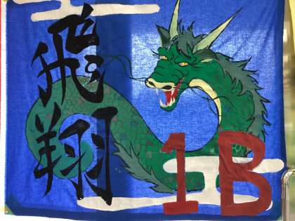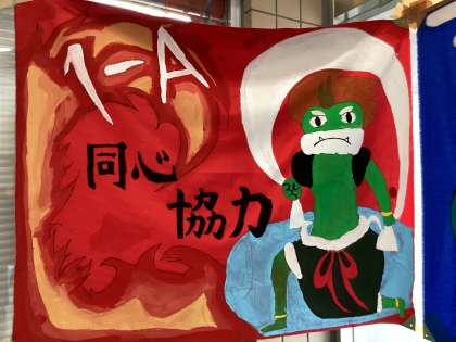 でも、ピロティーには、各クラスのクラス旗が完成し、スローガンと共に掲示されました。