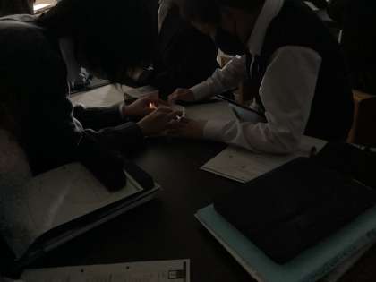 A組は理科。照明を落として、光の屈折についての実験をしています。