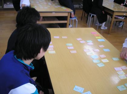 2月6日(火)一年生と合同の百人一首大会が行われます。そこで特別支援学級I組では、他のクラスに負けないよう猛特訓の真最中です。まだ五色に色分けした札を使って練習しているグループもありますが、そのうち白地の札で練習を始めます。冬休みに、得意札を増やしてきた生徒がたくさんいて頼もしいです。放課後の百人一首部でもがんばっています。