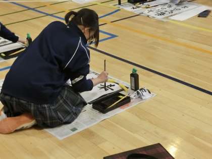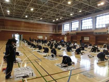 会場の体育館は静寂に包まれ、集中して真剣に筆を走らせていました。