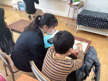 床に膝立ちしながら児童の目線に合わせ教えていました。