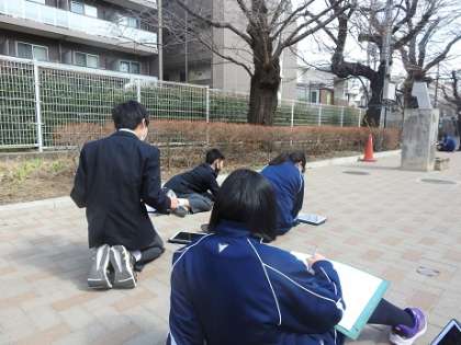 今週の美術では校舎の外へ出て、写生会をしました。天気も良く、みんな気持ち良さそうでした。