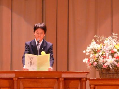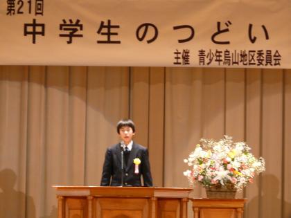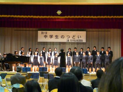 2月7日(土)「中学生のつどい」が烏山中学校で行われました。芦花中学校からは、弁論(英語スピーチ含む)で8人が出場し、2部では、2年生選択音楽+有志(31人)が「手紙」と「走る川」の合唱を披露しました。弁論では、身近な視点から、考えた事柄が語られ、聴衆の胸を打ちました。最優秀賞(1)、優秀賞(2)、奨励賞(1)、努力賞(1)、特別賞(3)をいただきました。合唱も、学芸発表会(舞台)での発表から日は経っていますが、さらに成長している姿を見せてくれました。