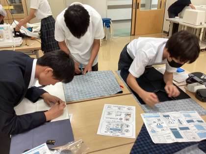 調理実習を終え、次の課題は、ミシンを使って鞄を作ることです。生地の慎重に裁断し、ぬいあわせます。