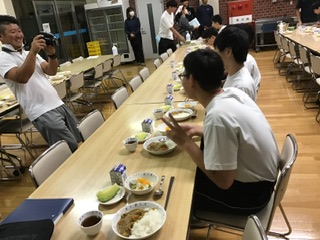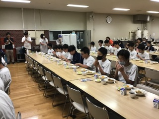 夕食の時間です。4校全員揃って…「いただきます!」