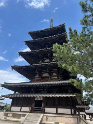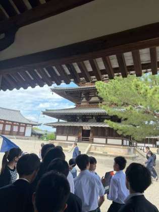 五重塔の説明をガイドさんがしてくれています。生徒は真剣に話を聞いています。