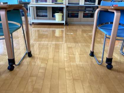 学校ではこの暑い日にも、学校清掃のソシオのみなさんが、学校中を丁寧に清掃してくださっています。今日は印刷室や視聴覚室などを、ワックスがけでキレイにしてくださいました。部屋に置いてあるものが、ピカピカの床に鏡のように反射しています!