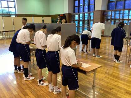 2学期が始まり、芦花中学校では、新たな生徒会の役員を決める選挙が行われました。I組では事前学習として、模擬選挙を行い、投票に臨みました。選挙管理委員の指示を聞いて、しっかりと自分の票を入れることができていました。