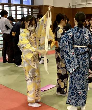 事前学習では日本の特徴的な文化である和服について学び、当日は講師の先生にいらしていただき、実際に浴衣の着方、帯の結び方などを体験しました。
