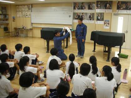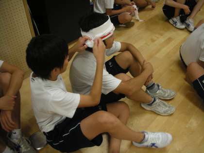 消防隊員の方に怪我などで出血をしている人への「止血法」を教えて頂き、実際に三角巾を使って、「止血法」の訓練を行いました。