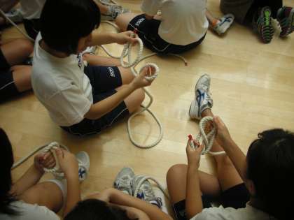 災害時に、ロープを使用して避難の補助とする方法を学びました。ロープに結び目をつくることで、足を引っ掛けることができ、避難に役立てることができると教えて頂きました。