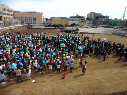 芦花小学校・中学校の児童・生徒や教職員、保護者の方々や地域の方々で、スミレの種の入った色とりどりの風船にメッセージカードを付けて一斉に飛ばしました。800個以上の風船が青空に飛んでいく様子は壮観でした。