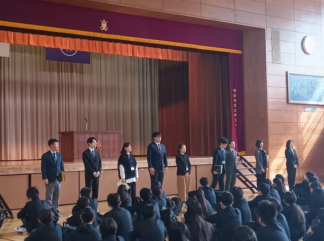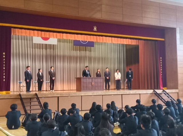 4月7日 令和7年度 始業式が行われました。今年度、着任された先生方の紹介、2,3年生の学年の先生方の紹介がありました。今年度も楽しい学校生活を送っていきましょう。