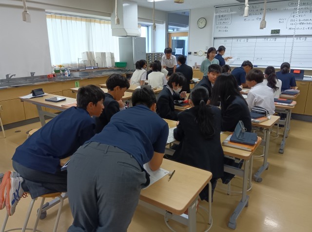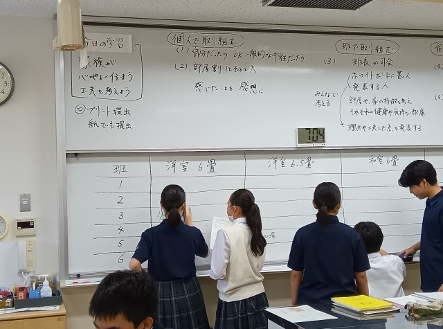 5月2日 2年生 2校時 家庭科の様子。住まいの空間の授業。家族 皆が 気持ちよく生活ができる間取りを友達と 相談しながら楽しそうに考えていました。