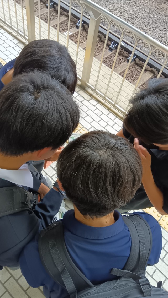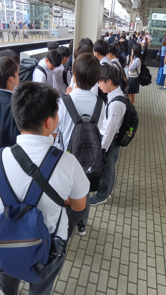 新幹線のホームで座席の確認をしながら、今日の思い出を共有しています。