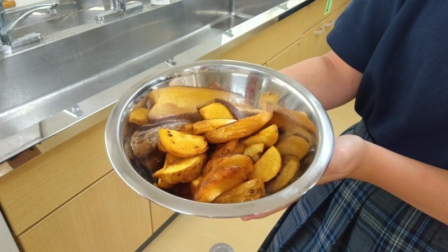 園芸部が学校の畑で収穫したジャガイモを使ってフライドポテトを作っています。