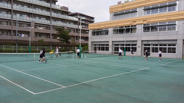 本日も本校の恵まれた施設をフルに活用し、校庭、小学校・中学校体育館、テニスコートで様々な部活が活動しています。