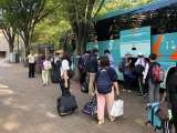 バスに乗り込み、いよいよ河口湖移動教室が始まります!