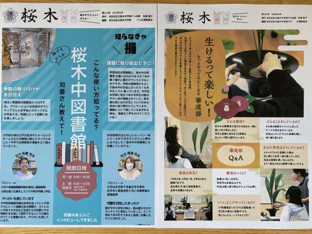 先日、すぐーるでお知らせいたしましたが、PTA広報誌「桜木」第141号、第142号が発行されました。141号は華道部の特集で、花を生ける部員の姿、華道の奥深い世界観などについて書かれています。142号は図書館特集。司書の先生にお話を伺いました。保護者の皆様も図書館へお立ち寄りください。