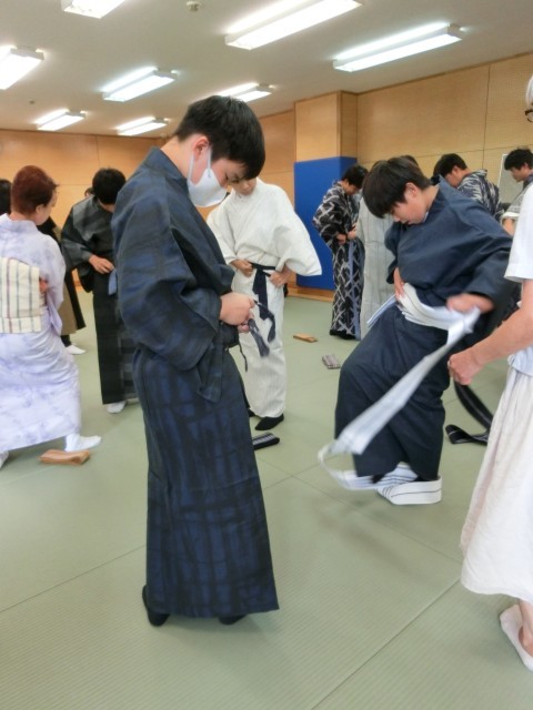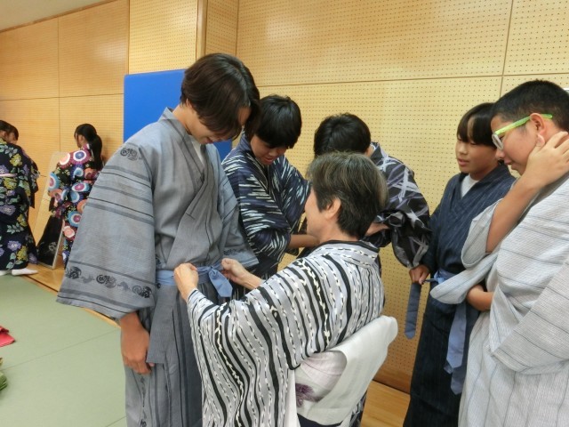 毎年2年生が取り組んでいるゆかたの着付け体験。世田谷区の教科『日本語』日本文化の内容を実体験で学んでいます。初めて袖を通す生徒がほとんどなので、おのずと真剣になります(菅野)