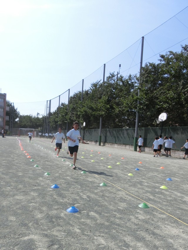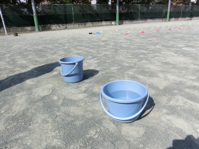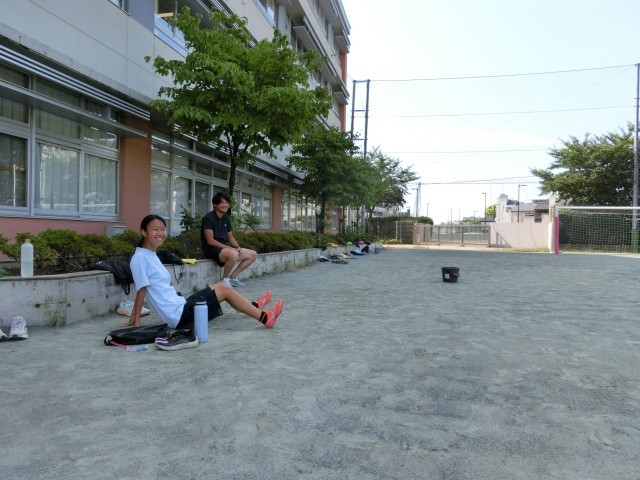 早朝から努力を重ねる陸上競技部ですが、その裏では目に見えない配慮をしています。酷暑の中、少しでも体内の熱を上げないようにするため、バケツに水をため走る前に太い血管が通る手首を冷やす工夫や、こまめな水分補給など多々あります。一番下の画像は顧問と談笑する3年生部員。彼女はこの週末、陸上の東京都大会で100m走4位に入りました。その時の様子を聞いてみると「卒業した先輩が応援に来てくれたことがとてもうれしかった」とのこと。実は昨年度、3年生は全国大会に出場しているので、その背中を追いかける目標にかなりの重圧を感じていたけれど、今回は「どうせ走るなら楽しんで」と思えたことが結果につながったとも話してくれました。彼女の次なる目標は、8月末に行われる全国につながる陸上競技大会でさらに上の結果を出すこと。「中3なので勉強との両立が難しいのが悩みです」と素直に答えてくれました。思わず心の中で応援の旗を思いっきり振りたくなりました(菅野)
