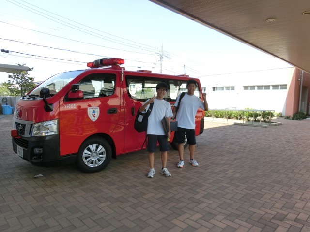 校内に消防車!? 公開日 2025/09/08 更新日 2025/09/08 今日のできごと 午後の正門付近。消防署の赤い車が止まっています。降りてきたのは消防署の職員の方と2年生。職場体験で勉強したことを、普段自分たちがいる桜木中で検証してみようという事で連れてきてくださいました(菅野) いいね(2) 2年 キャリア教育